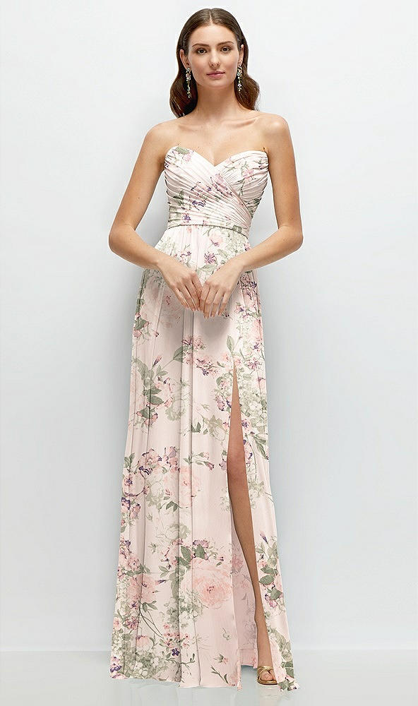 Strapless Pleated Surplice Chiffon Maxi Dress with A-Line Skirt in Blush Garden