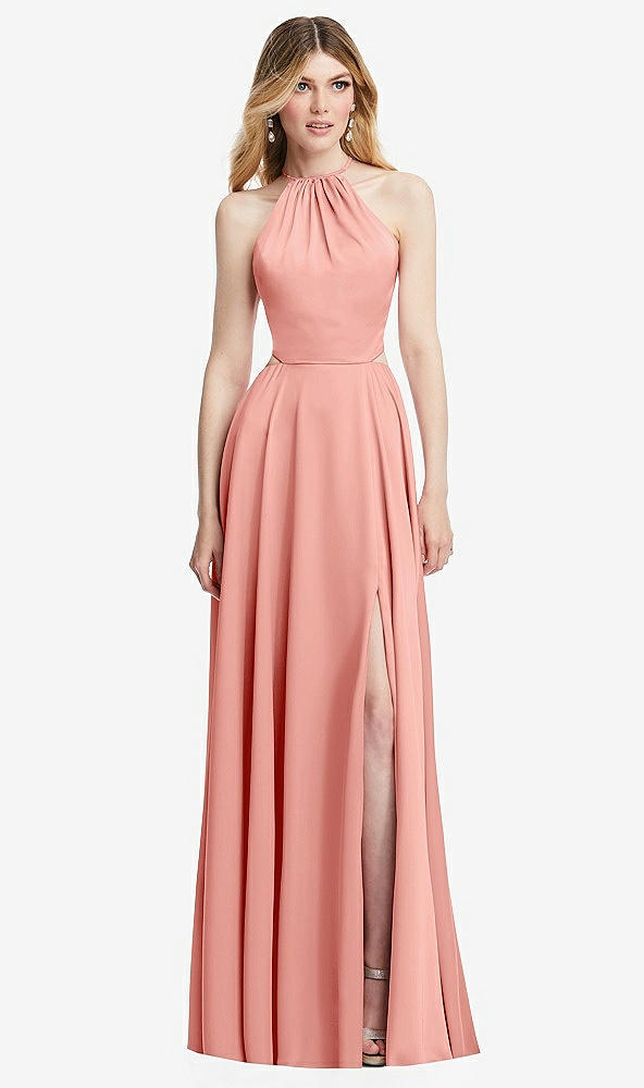 From prom wear to an upscale wedding event, this alluring halter maxi dress is flattering and chic. Whisper satin fabric offers a luminous finish to this glam gown. It oozes drama with a shirred halter neckline, open gathered cross-strap back, and an elastic back waist embellished with gathers. Sleek with a high side split, its modified circle skirt flows as it accommodates easy movement.