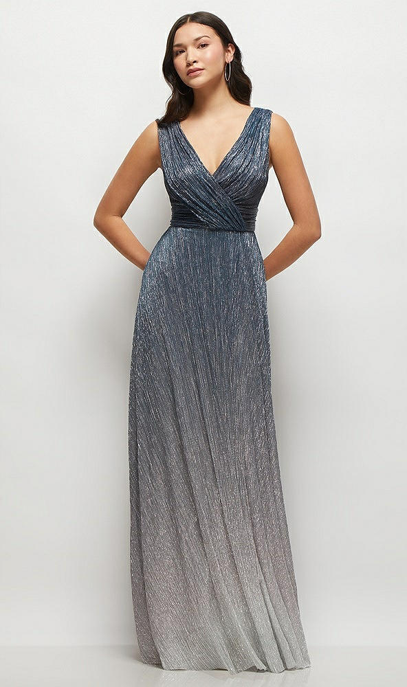 Draped V-Neck Ombre Pleated Metallic Maxi Dress with Deep V-Back in Cosmic Blue