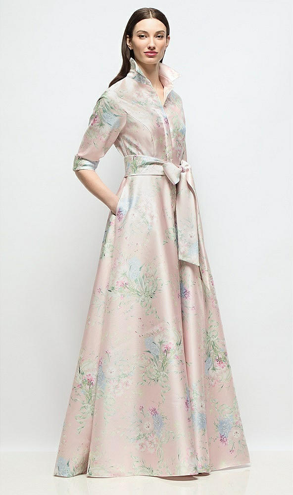 3/4 Sleeve Esme Floral Satin Shirt Dress Gown with Sash & Jeweled Buttons in Esme Floral