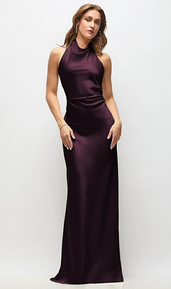 High Cowl Neck Open-Back Stretch Satin Bias Maxi Dress in Deep Plum