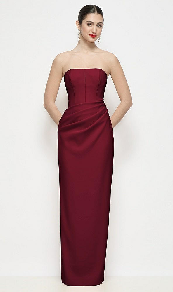 Strapless Asymmertical Drop Waist Corset Maxi Dress with Column Skirt in Burgundy