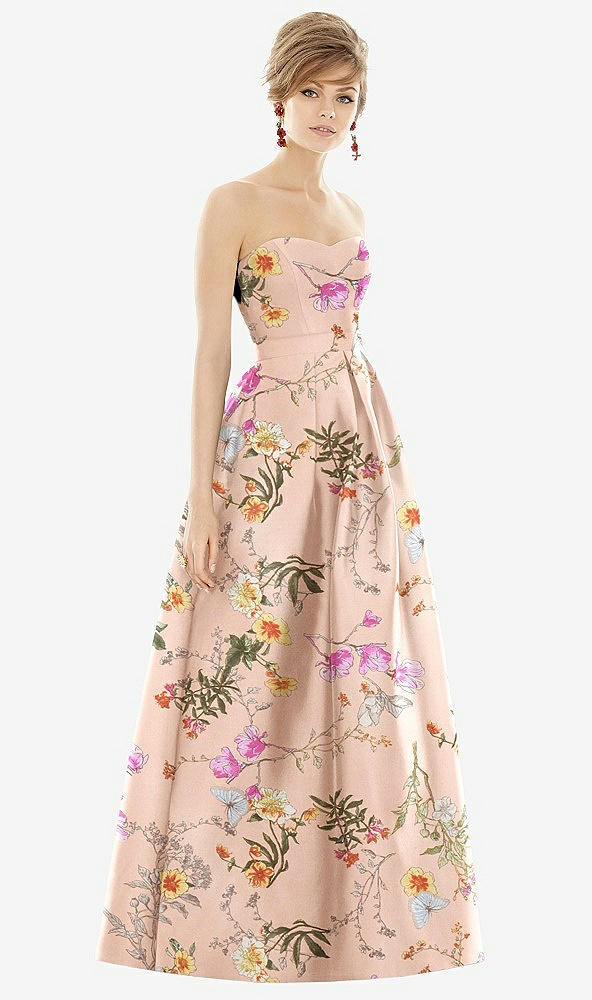 Strapless Pleated Skirt Floral Satin Maxi Dress with Pockets in Butterfly Botanica Pink Sand