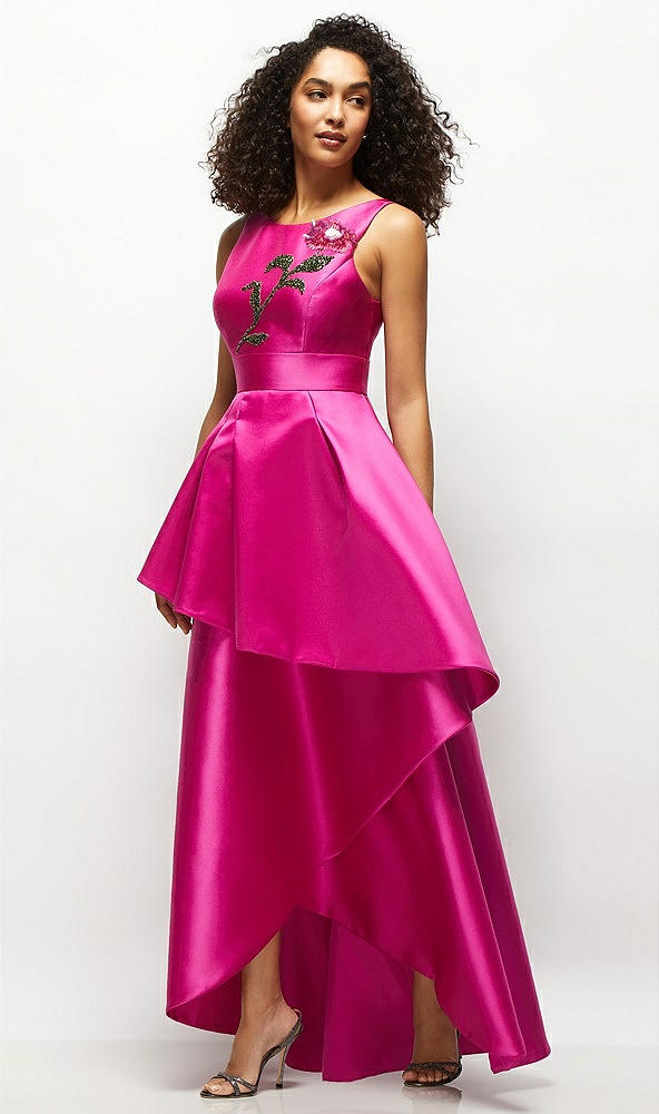 Beaded Floral Bodice Satin Maxi Dress with Layered Ballgown Skirt in Think Pink