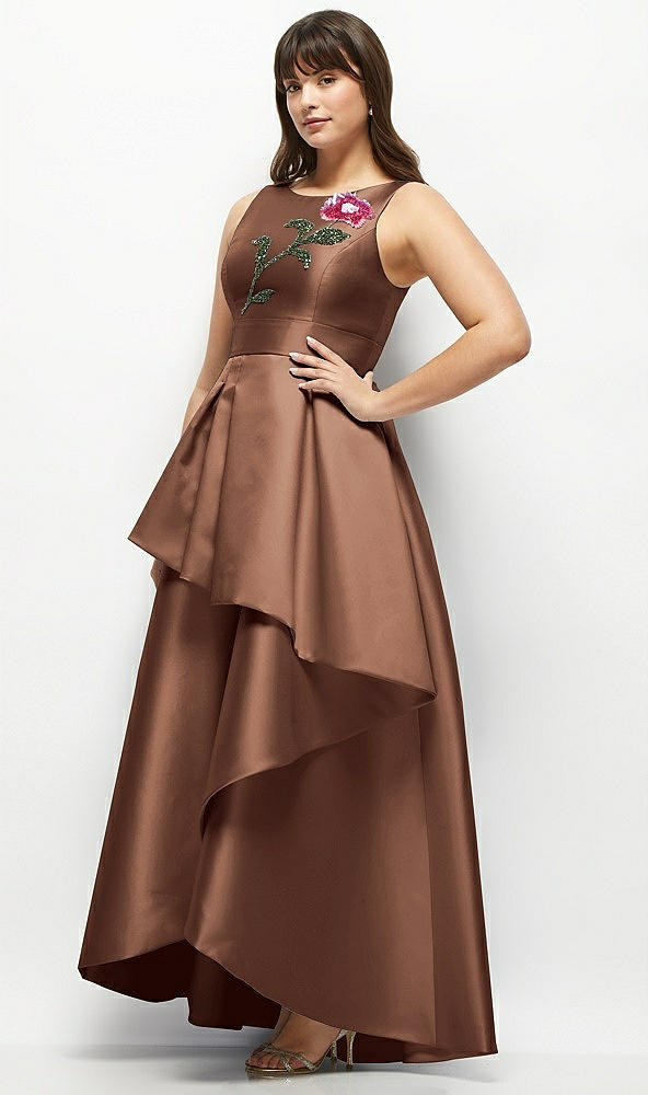 Beaded Floral Bodice Satin Maxi Dress with Layered Ballgown Skirt in Cognac