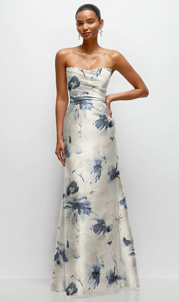 Strapless Cat-Eye Draped Bodice Floral Satin Tumpet Dress in Inkwash Blue Floral