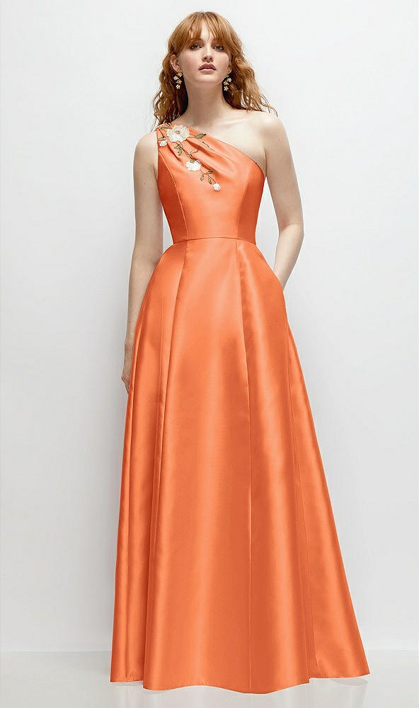 One-Shoulder Full A-Line Satin Gown with Handworked Floral Appliqué in Portofino Orange