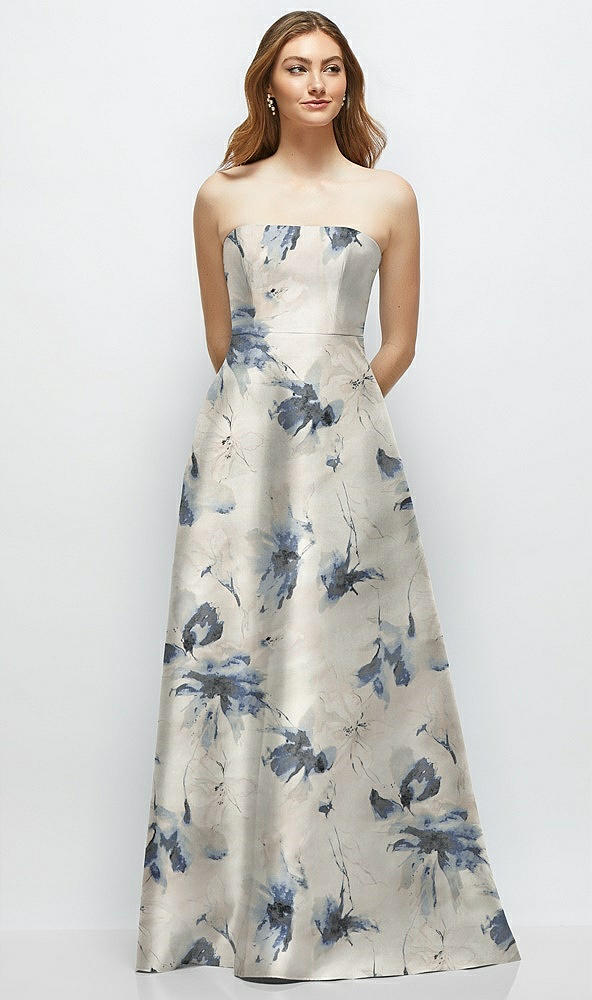 Strapless Floral Satin Gown with Full Skirt and Covered Buttons at Back in Inkwash Blue Floral