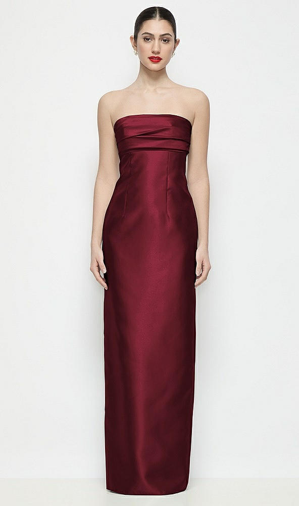 Strapless Pleated Empire Satin Column Maxi Dress in Cabernet
