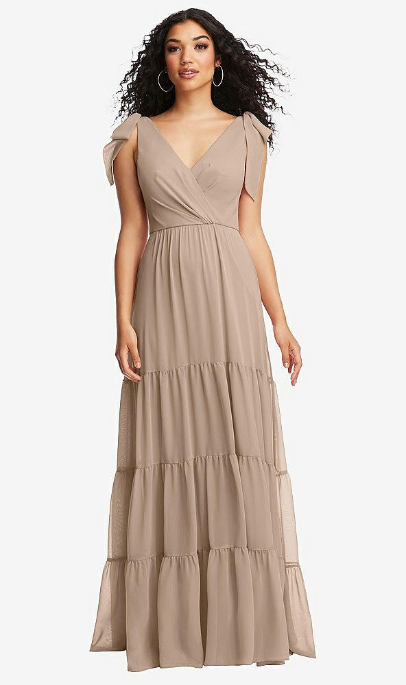 Embrace romance in a lux chiffon maxi dress delivering Boho vibes with a four-tiered skirt and easily removable bow shoulder details. Light and airy, this free-spirited maxi dress offers a flattering, lightly shirred faux wrap V-neck bodice. Ideal for a desert wedding or a garden party, its breezy, chic look is a no-brainer.