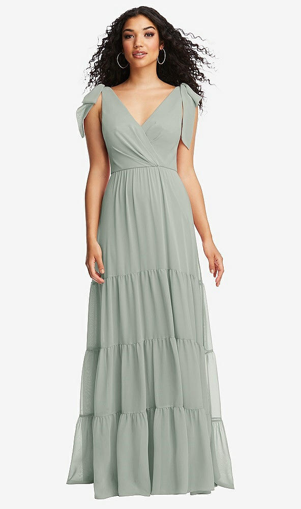Bow-Shoulder Faux Wrap Maxi Dress with Tiered Skirt in Willow Green