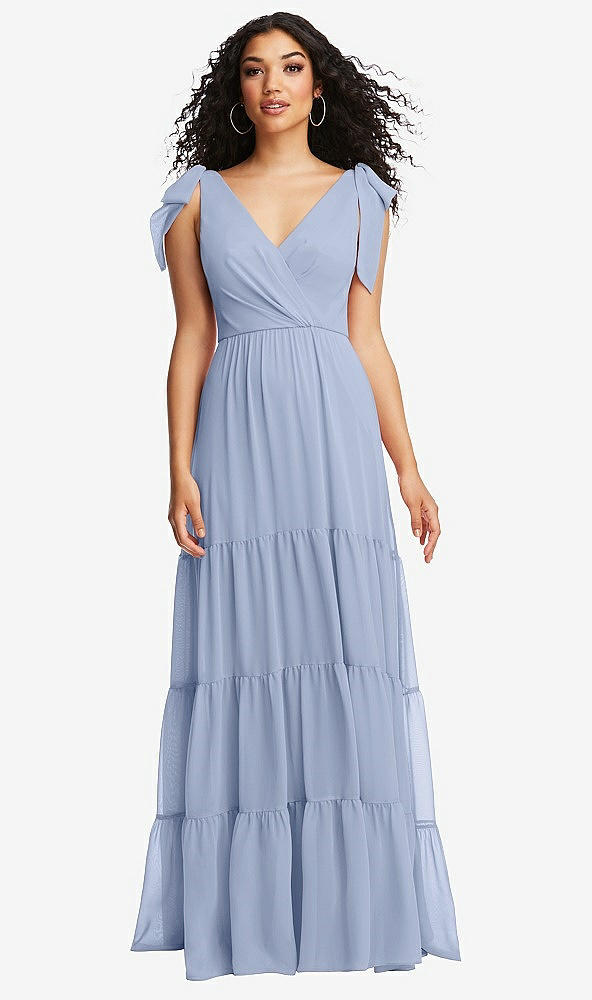 Front View Thumbnail - Sky Blue Bow-Shoulder Faux Wrap Maxi Dress with Tiered Skirt