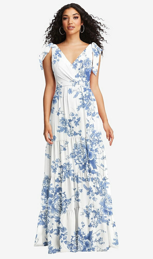 Bow-Shoulder Faux Wrap Maxi Dress with Tiered Skirt in Cottage Rose Dusk Blue