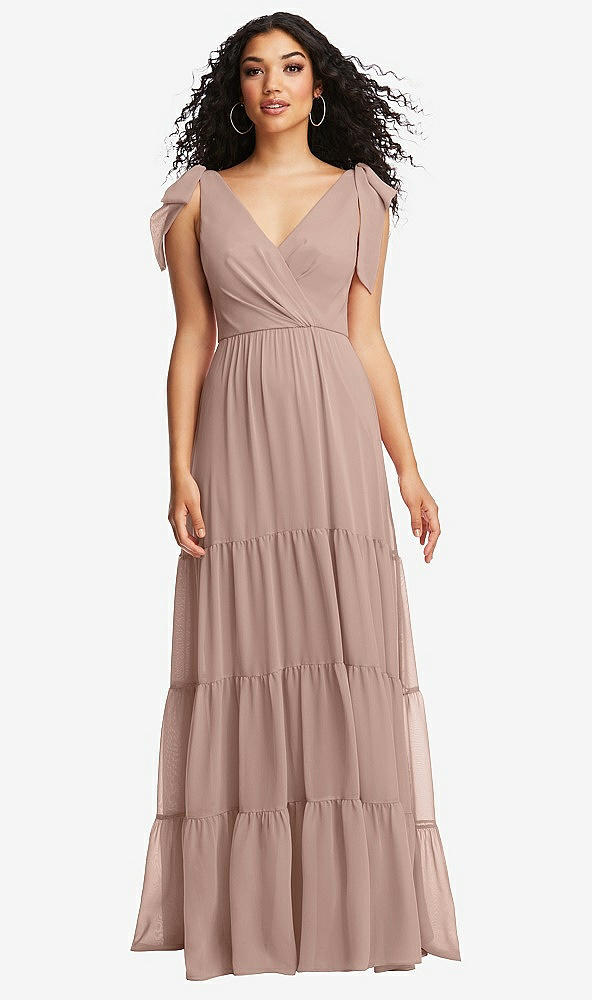 Front View - Neu Nude Bow-Shoulder Faux Wrap Maxi Dress with Tiered Skirt