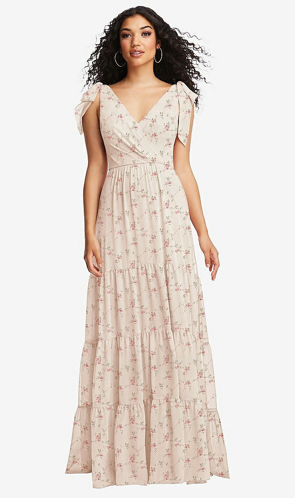 Front View - Coquette Floral Print Bow-Shoulder Faux Wrap Maxi Dress with Tiered Skirt