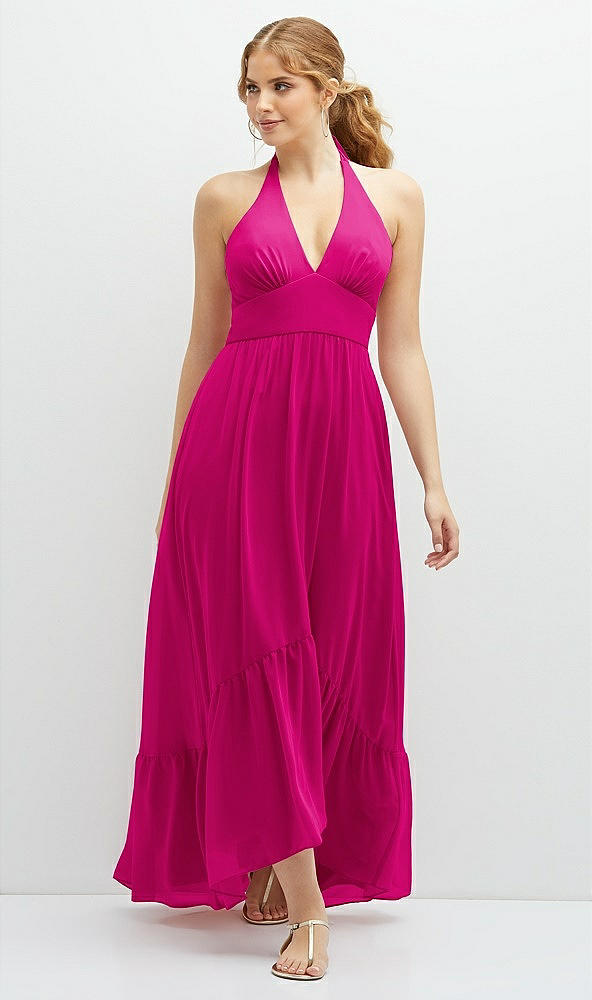 Chiffon Halter High-Low Dress with Deep Ruffle Hem in Think Pink