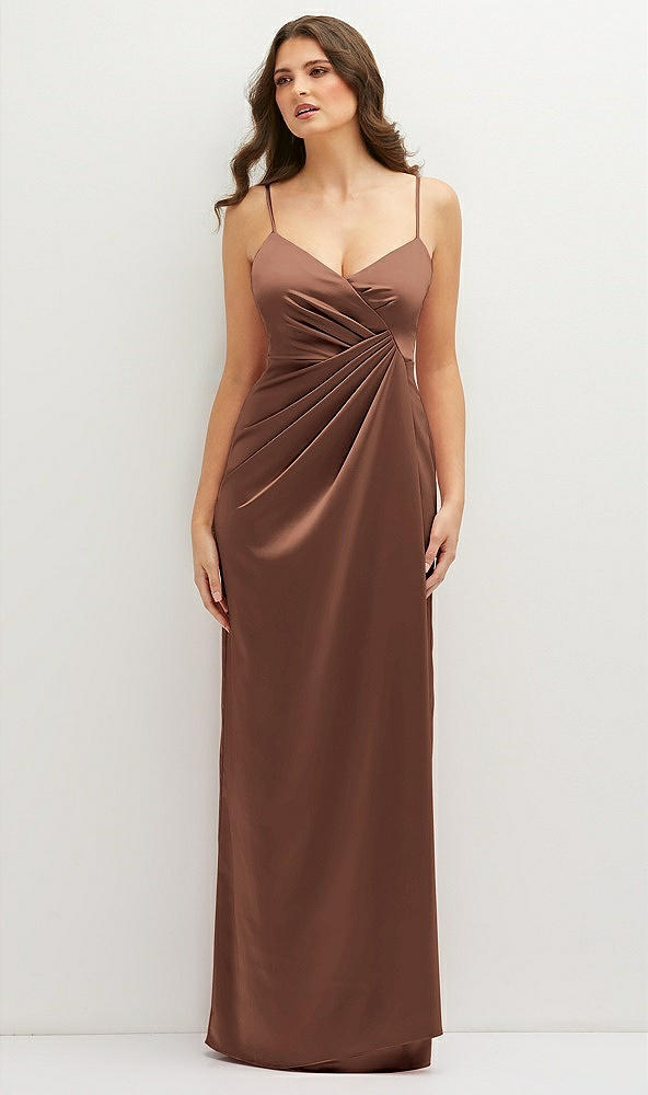 Side View - Cognac Asymmetrical Draped Pleat Wrap Satin Maxi Dress