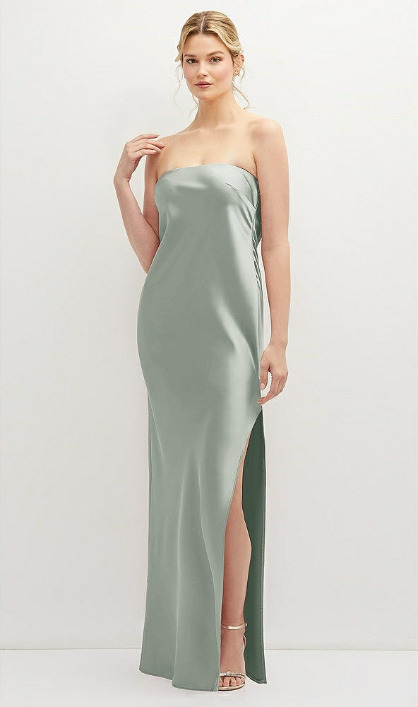 Strapless Pull-On Satin Column Dress with Side Seam Slit in Willow Green
