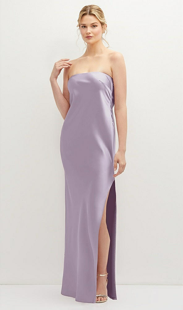Strapless Pull-On Satin Column Dress with Side Seam Slit in Lilac Haze