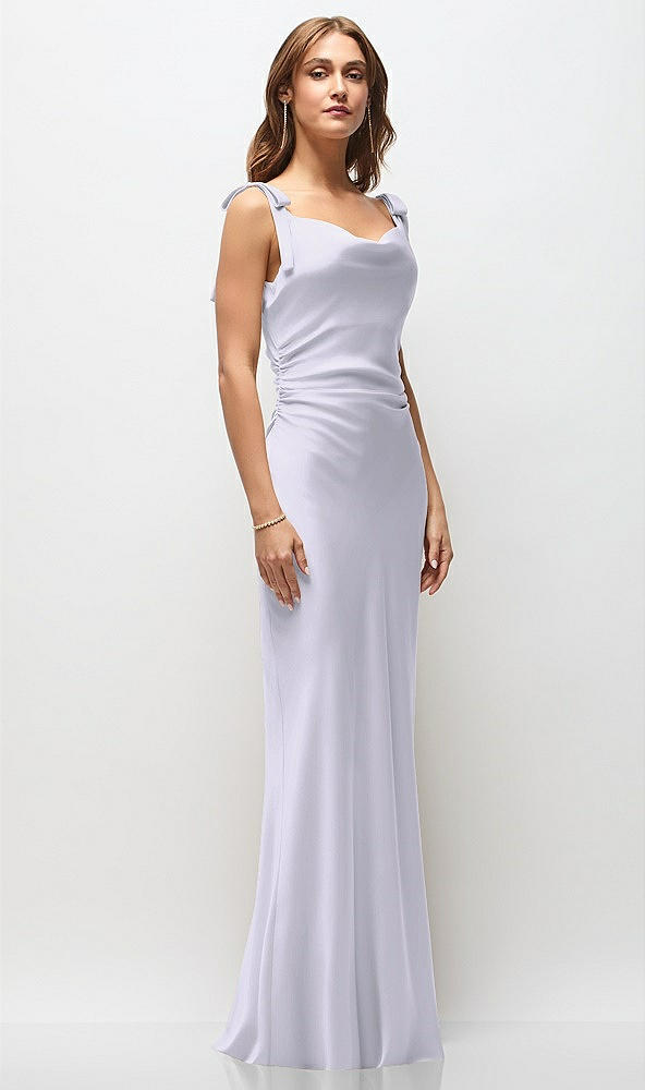 Soft Cowl Neck Ruched Side Satin Bias Maxi Dress with Shoulder Bows in Silver Dove