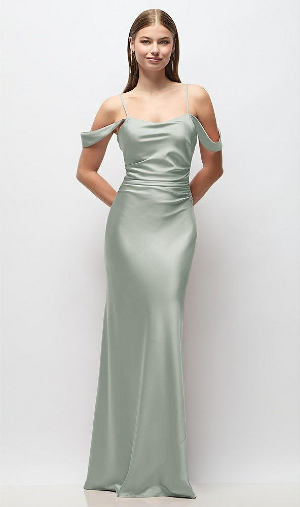 Off-the-Shoulder Swag Ruched Side Satin Bias Maxi Dress with Adjustable Spaghetti Straps in Willow Green