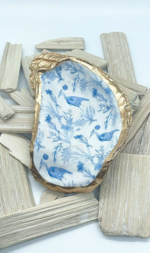 Pop this Chinoiserie Blue Heron print oyster trinket dish by your sink or beside your bed to keep your fav rings, jewelry or trinkets. It also makes a seriously chic paperweight, bringing beachy vibes into your home. Each upcycled oyster shell is hand-painted with a timeless blue and white Chinoiserie design, decoupaged, and finished off with a slick gold leaf edge. The shell back is left all-natural to show off the oyster's raw beauty. Each one-of-a-kind oyster shell ring dish is like a snowflake—totally unique in shape and size (and print)!