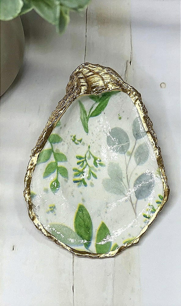 Pop this eucalyptus print oyster trinket dish by your sink or beside your bed to keep your fav rings, jewelry or trinkets. It also makes a seriously chic paperweight, bringing beachy vibes into your home. Each upcycled oyster shell is hand-painted with a rustic greenery design, decoupaged, and finished off with a slick gold leaf edge. The shell back is left all-natural to show off the oyster's raw beauty. Each one-of-a-kind oyster shell ring dish is like a snowflake—totally unique in shape and size (and print)!