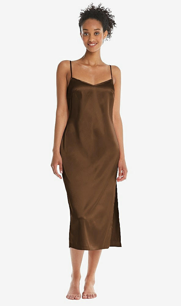 Side View - Latte  Midi Stretch Satin Slip with Adjustable Straps - Asley