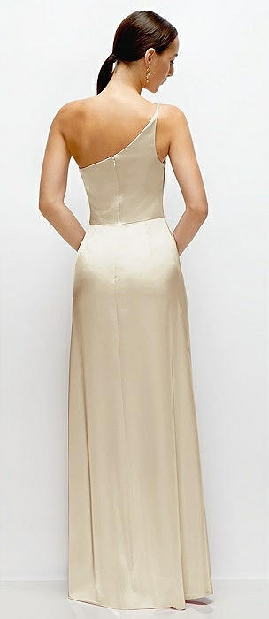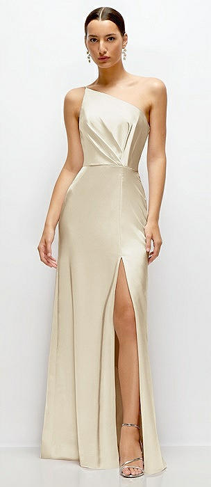Pleated One-Shoulder Satin Maxi Dress with A-Line Skirt in champagne