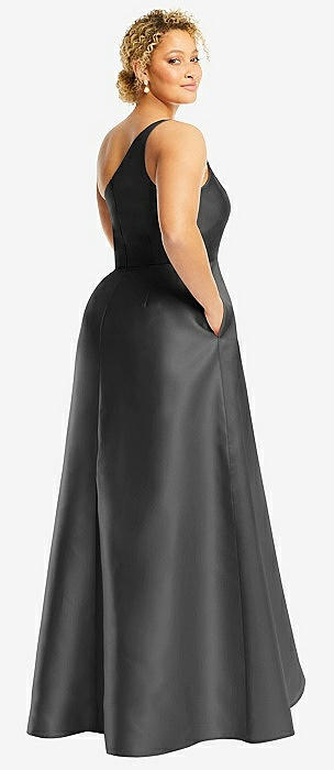 One-Shoulder Satin Gown with Draped Front Slit and Pockets in pewter