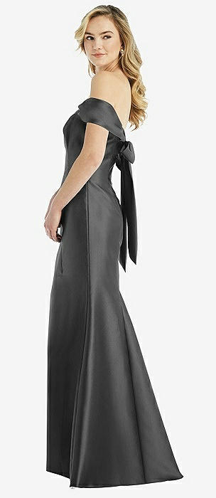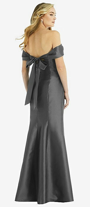 Off-the-Shoulder Bow-Back Satin Trumpet Gown in pewter