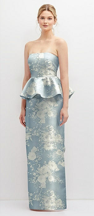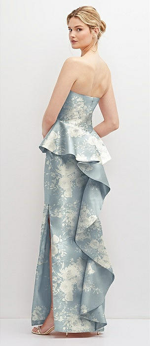 Floral Strapless Satin Maxi Dress with Cascade Ruffle Peplum Detail in porcelain blue seraphina floral