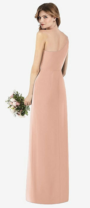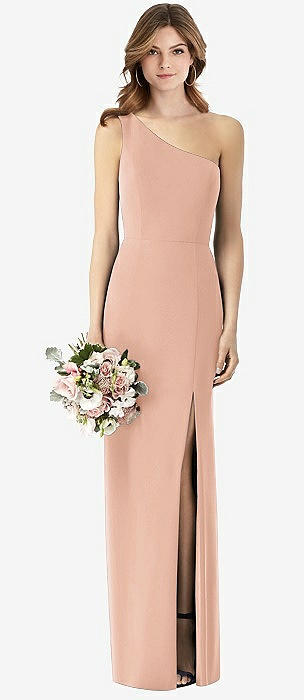 One-Shoulder Crepe Trumpet Gown with Front Slit in pale peach