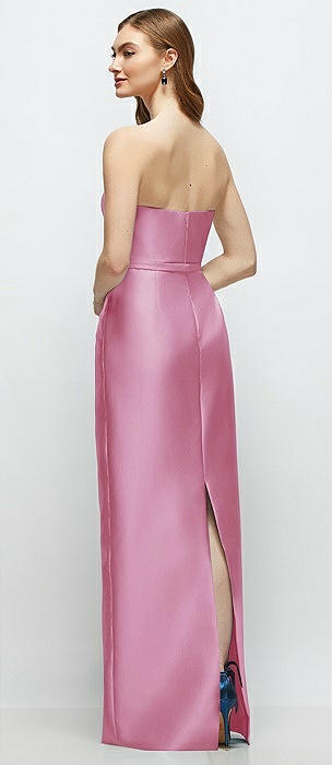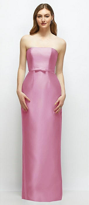 Strapless Satin Column Dress with Bow-Trimmed Skinny Belt in powder pink