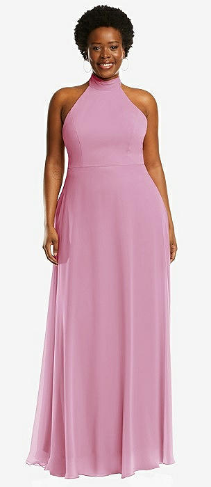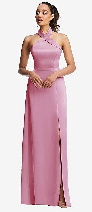 Shirred Skirt Jewel Neck Halter Dress with Front Slit in powder pink