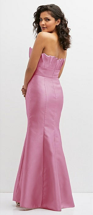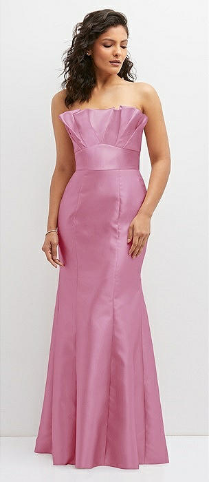 Strapless Satin Maxi Dress with Cascade Ruffle Peplum Detail in powder pink