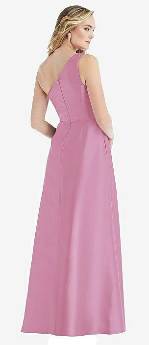 One-Shoulder Satin Gown with Draped Front Slit and Pockets in powder pink