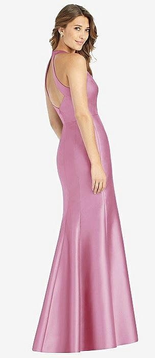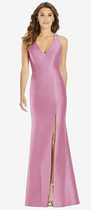 V-Neck Halter Satin Trumpet Gown in powder pink