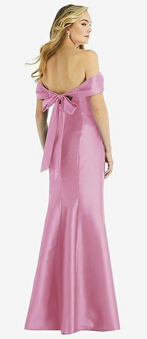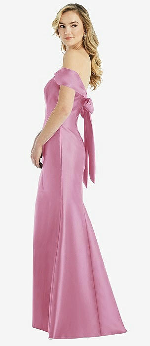 Off-the-Shoulder Bow-Back Satin Trumpet Gown in powder pink