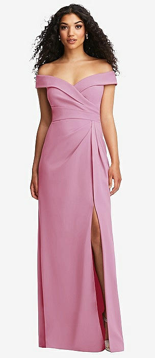 Cuffed Off-the-Shoulder Pleated Faux Wrap Maxi Dress in powder pink