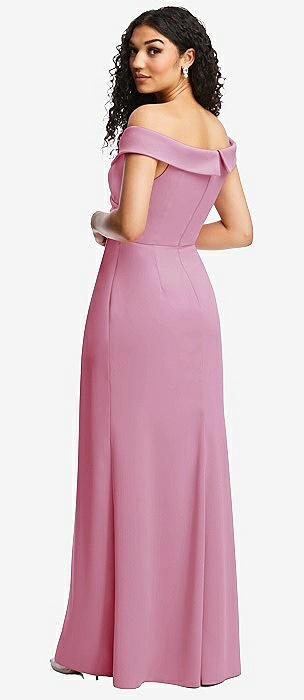 Off-the-Shoulder Criss Cross Back Trumpet Gown in powder pink