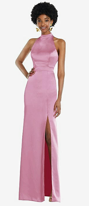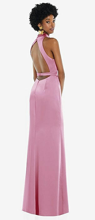 High Neck Backless Maxi Dress with Slim Belt in powder pink