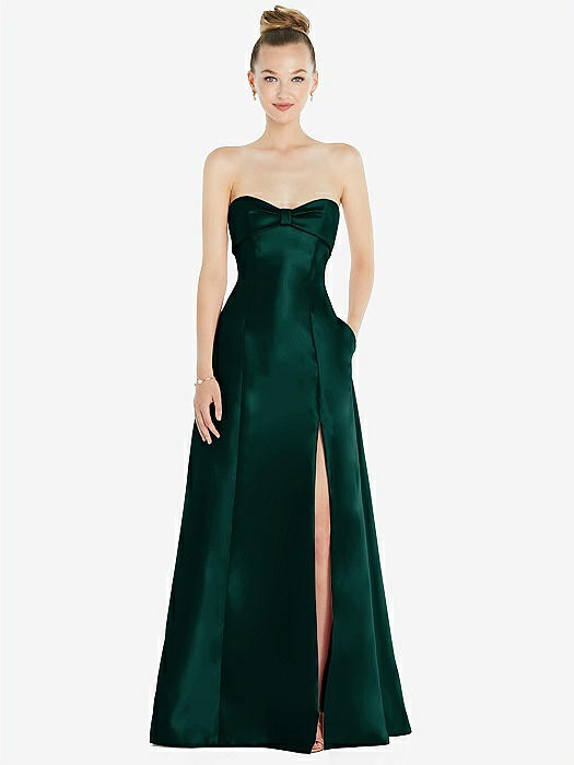 Strapless A-line Satin Gown with Modern Bow Detail in hunter green