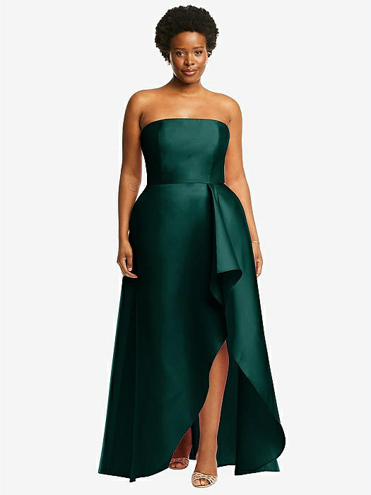 Strapless Satin High Low Dress with Pockets in evergreen