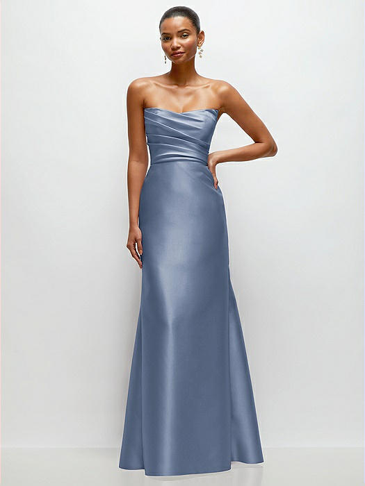 Strapless Cat-Eye Draped Bodice Satin Tumpet Dress in larkspur blue