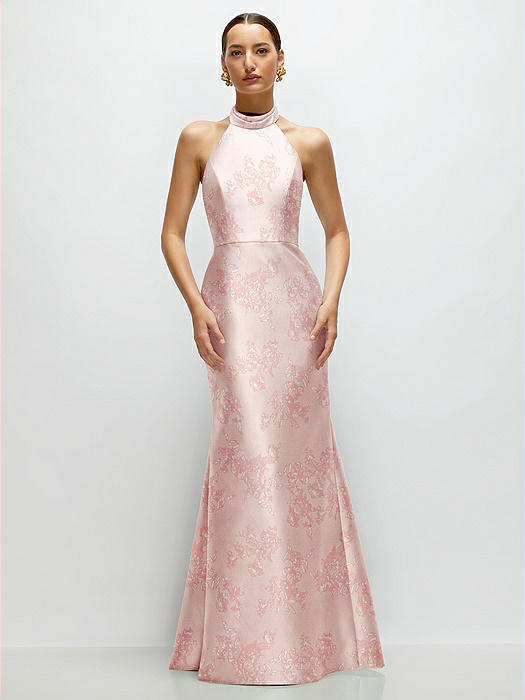High-Neck Halter Open-Back Floral Satin Trumpet Dress in bow and blossom print