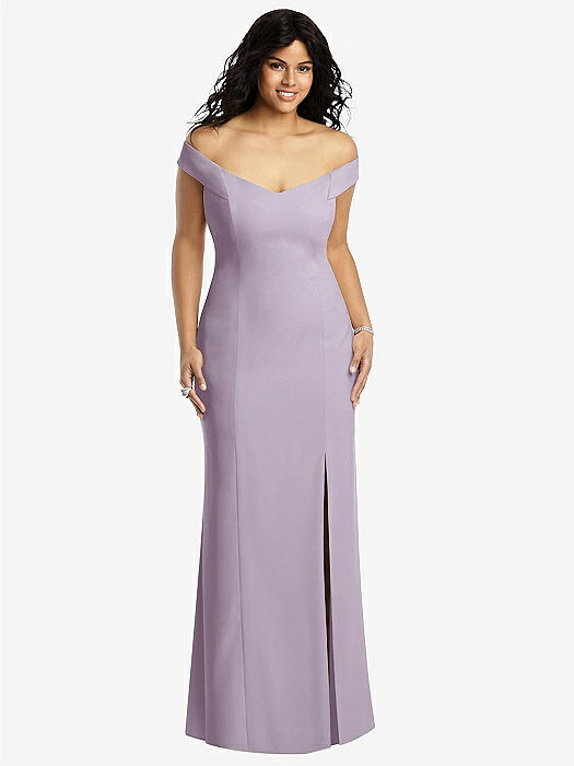 Off-the-Shoulder Criss Cross Back Trumpet Gown in lilac haze