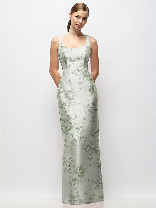 Scoop Neck Floral Satin Column Maxi Dress in sage cottage rose