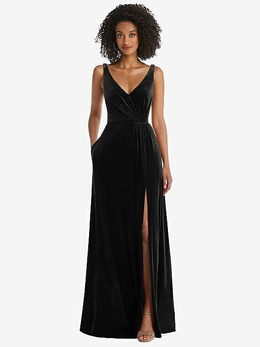 Velvet Maxi Dress with Shirred Bodice and Front Slit in black