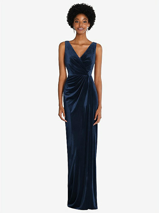 Draped Skirt Faux Wrap Velvet Maxi Dress in midnight navy